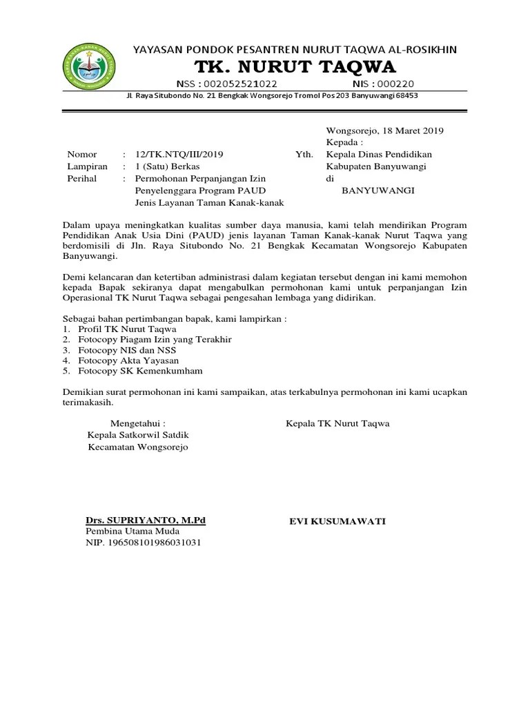Berita acara keterlambatan perpanjangan izin operasional (bagi . Admin blog kumpulan surat penting juga . Dengan ini kami mengajukan permohonan perpanjangan ijin operasional kepada dinas pendidikan kabupaten pasuruan. Bendel permohonan perpanjanganijin penyelenggaraan sekolah swasta1.surat permohonan 2.profil sekolah3.ijin penyelenggaraan sekolah swasta4. Surat permohonan nomor :61/104.3/smk ind.